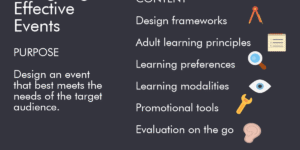 Four simple tips to help you get your event design right Be clear on the purpose of the event design and make sure this guides you throughout. This should also be clearly communicated to your target audience. Use Adult Learning Principles to design the event activities. Remember we...