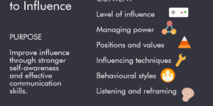 Aim of the Communicate to Influence workshop The Communicate to Influence workshop will enable your team to improve their influence through stronger self-awareness and effective communication skills. Workshop outcomes By completing the Communicate to Influence workshop, participants will be able to: Build stronger awareness of self to improve influence Understand...