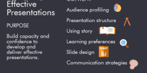 Aim of the Designing Effective Presentations workshop The Designing Effective Presentations workshop will enable your team to build their capacity and confidence to develop and deliver effective presentations. Workshop outcomes By completing the Designing Effective Presentations workshop, participants will be able to: Have a clear and structured approach to the...